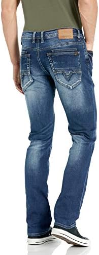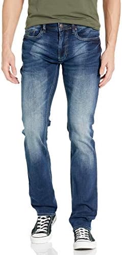Ash-x slim fit denim jean in a dark indigo wash featuring five pocket styling, sandblasting detail, fashion detail on back pockets, belted waistband with brand patch at bag, and zip fly with button closure