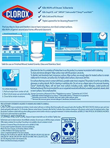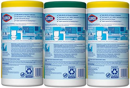 Clorox Disinfecting Wipes are triple-layered to clean, disinfect, deodorize and remove allergens for 5x Cleaning Power and leave a pleasant scent. Disinfecting Wipes clean and disinfect with antibacterial power that kills 99.9% of viruses and bacteria that can live on surfaces up to 48 hours, including staph, E. coli, MRSA, salmonella, strep and Kleb. These all-purpose disposable wipes remove common allergens, germs and messes on surfaces like kitchen counters, bathroom surfaces and more. Wipes are safe to use on finished wood, sealed granite and stainless steel. Disinfecting Wipes are also great on non-food-contact surfaces in the home, office, classroom, pet area, dorm and locker room. Clean with bleach-free wipes to keep dirt and germs away.