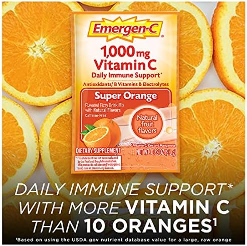 Emergen-C vitamin C drink mix is a great way to support your daily wellness routine. Emergen-C provides Daily Immune Support* with more Vitamin C than 10 oranges (1) – and is packed with B Vitamins to enhance energy* naturally, Electrolytes and Antioxidants (2). Emergen-C Vitamin C drink mixes are made with natural, real fruit flavors, plus they have no artificial sweeteners and are caffeine-free. Mix with 4 to 6 ounces of water for a fizzy, fruity boost of goodness. With dozens of tasty flavors and a variety of special formulas, Emergen-C Original Formula vitamin mix makes it deliciously easy to support ongoing wellness goals. Transform every day with immune-supporting Vitamin C from Emergen-C. (1) Based on using the USDA.gov nutrient database value for a large, raw orange (2) Antioxidants include Vitamin C, Zinc and Manganese *These statements have not been evaluated by the Food and Drug Administration. This product is not intended to diagnose, treat, cure, or prevent any disease.