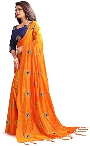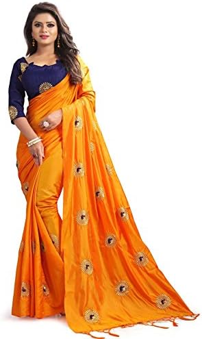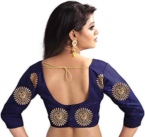 ?????’? ?????: Saree Fabric is Paper silk. The embroidery work covers saree of 5.5 meters in length. Blue Georgette thread used along with the Golden Silk thread for work on the whole saree. ???????? ??? ??????? ?????????: The saree is a suitable option when you want to dress right for a festive occasion or a ceremony. Pair this saree with matching sandals and earrings along with a clutch for a complete look. Preferable for wedding. This gives very different look to your style. ????? ???? ??????????? ?????? ?????: The saree comes along with a blouse piece which is 0.80 meters in length. The blouse piece is unstitched and can be customized according to your style and fit. ????? ??????????? ????: Machine Embroidery is with Golden Thread and always under prevention. Every Product checked Personally. The saree have Heavy Embroidered Work Pallu and Blouse which gives Royal Look of saree.