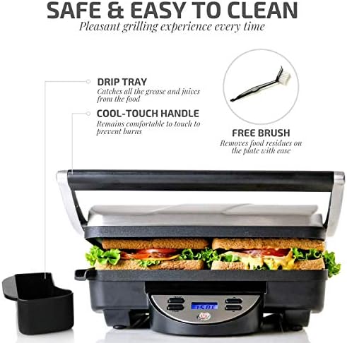 Ovente’s Stainless Steel Electric Gourmet Panini and Sandwich Maker makes grilling virtually foolproof! The 4-slice 10 2 x 9” non-stick coated plates quickly and evenly heat up your food with 1500-watts of power so there’s no need to flip it or even watch over it It comes equipped with a 30-minute timer with Auto Shut-Off technology when your food is ready It also comes with an LCD display with digital temperature settings displayed accurately between 150-425° F The floating lid allows for versatility of foods you can grill with this handy tool From melty grilled cheese sandwiches to juicy ribeye steaks—this grill does it all! Its convenient automatic settings make it perfect for everyday use especially for weekdays when you don’t have much time to prepare lunch or dinner It even makes multitasking and clean up a breeze With the FREE grill brush simply scrub debris away from the non-stick grill The included drip tray catches all excess fats and liquids so disposal is quick and painless It also helps make all of your grilled foods healthier by only keeping the fats and oils that add depth to your scrumptious meal no extra fat Grilling is made easy in 4 quick steps 1 Prepare sandwich as normal with your favorite fresh ingredients 2 Place on non-stick grill plate 3 Set the timer 4 Take it out when it’s done and enjoy!