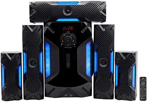 The 8” subwoofer provides super clear deep, rich bass with no rattling or discernible distortion even at high volumes. It has a built in media player/receiver with digital readout, a 5-band EQ, FM radio, Bluetooth, SD/USB input, and two ¼” MIC inputs with echo control for Karaoke on the front. On the rear you have 5 RCA audio outputs, 6 RCA DVD audio inputs, 2 RCA AUX inputs, and an FM antenna input. There are also 5 RCA inputs to power each speaker’s LED. A full function remote control is included so you never have to leave the comfort of your chair. The system also features an LED light system with multiple modes. The subwoofer LEDs can be set to blink to the beat, look like an EQ spectrum analyzer, or change colors (constant or cycle). The satellite speakers have cool blue LEDs that can be turned on or off.